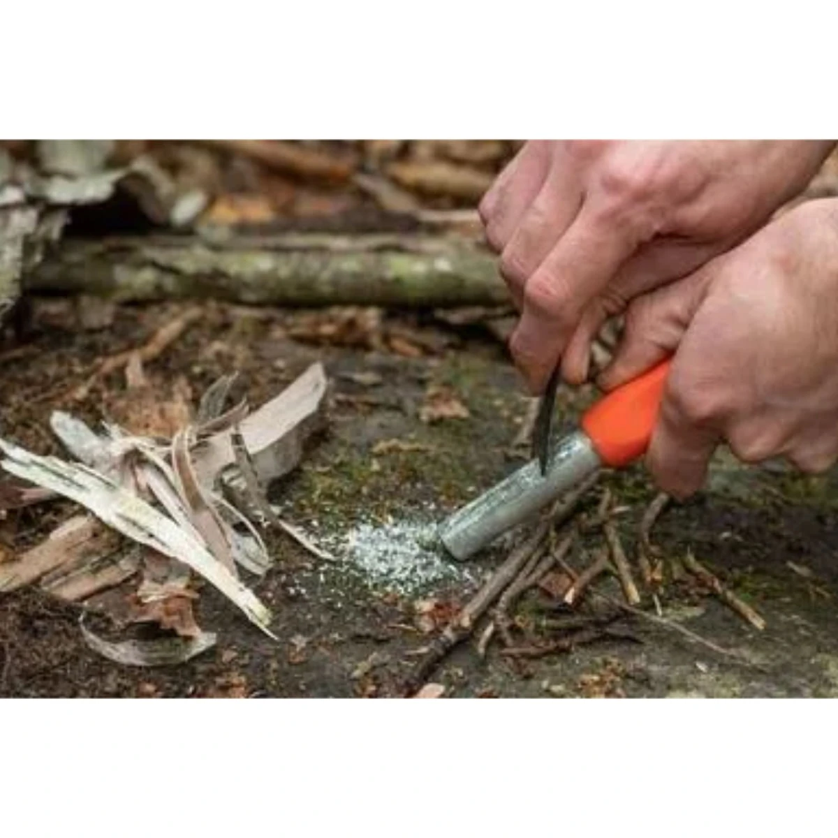 - Striking the straight edge against the flint rod creates a shower of sparks to ignite the magnesium and light your kindling
