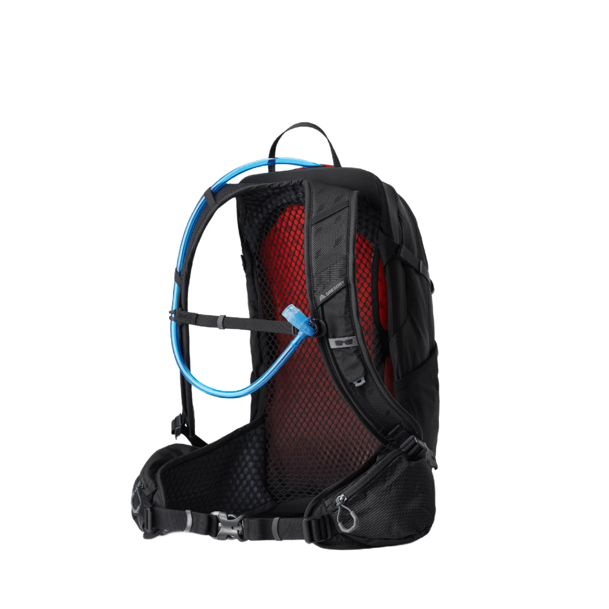 - Breathable shoulder harness with magnetic sternum buckle and hose clip for the reservoir bite valve