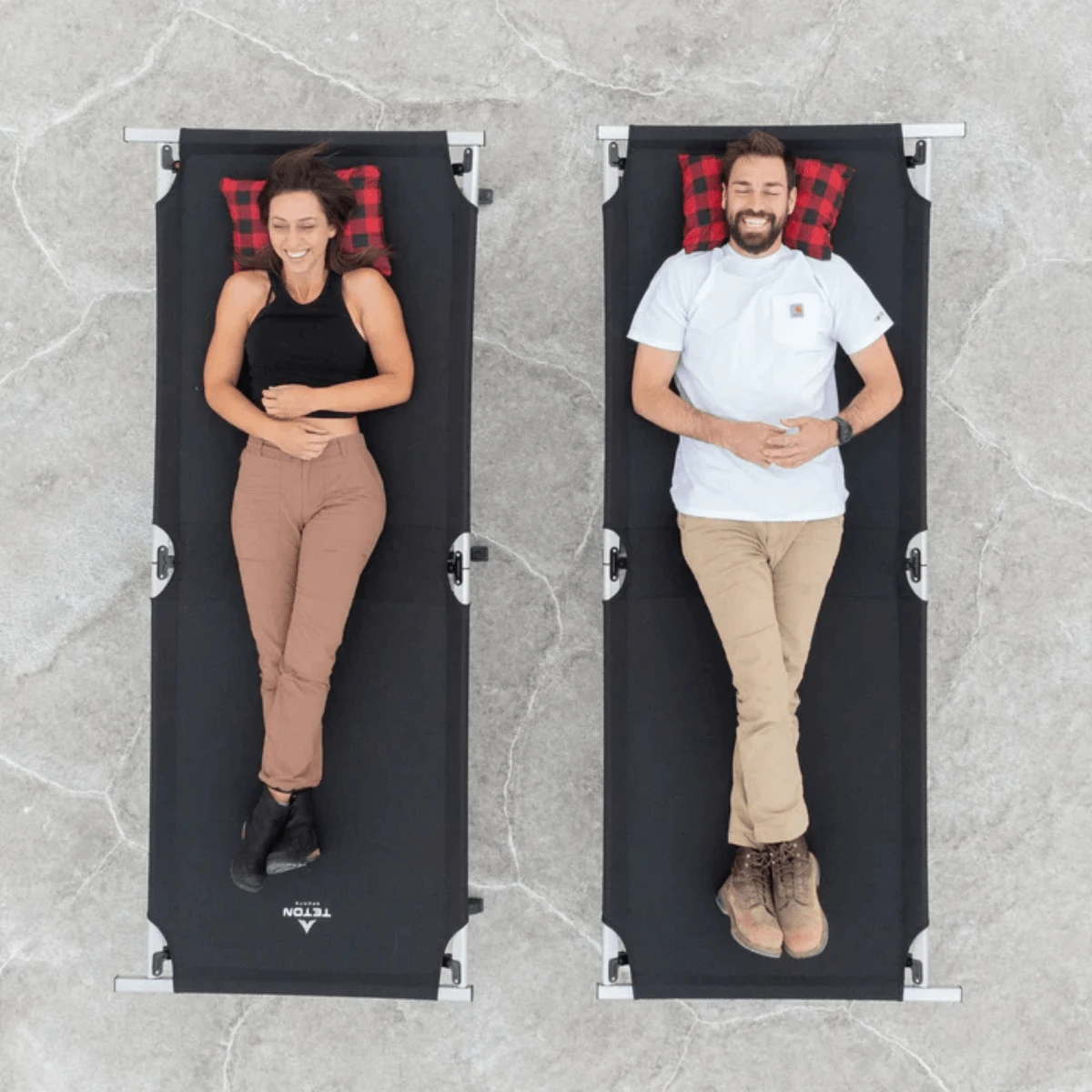 With the Universal Camp Cot Teton set out to make a super-strong cot that would feel as good as your bed at home and be easy to set up. So the strength is in the steel X-leg design. It has a 400 lb (181 kg) weight capacity. But there’s more: